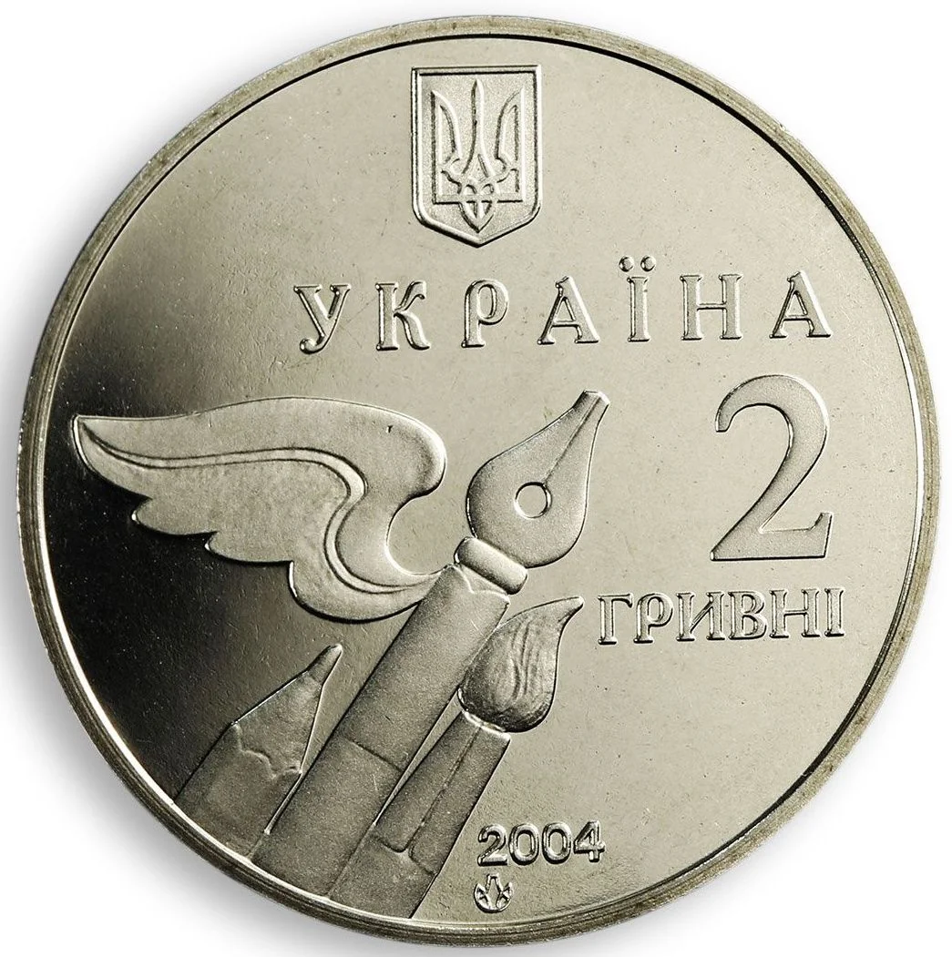 The obverse features Ukraine's small national emblem and the inscription "УКРАЇНА." The central design is a composition of a pencil, a winged pen, and a brush. To the right are the denomination "2/ГРИВНІ," and below, the year 2004 and the Mint's logotype.