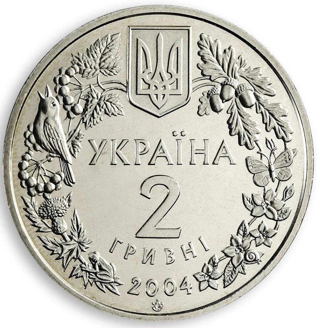 The small National Emblem of Ukraine is set within a wreath of plants and animals, surrounded by the legend: УКРАЇНА, 2, ГРИВНІ, 2004, and the NBU Mint logotype.