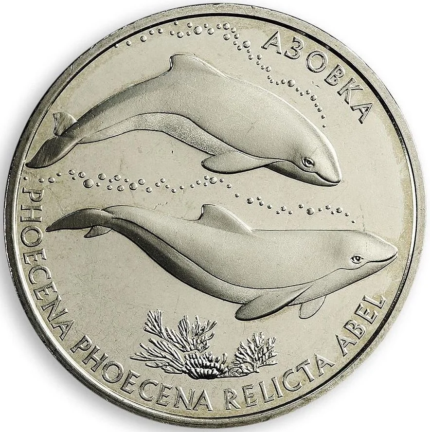 Two Azov Dolphins swim above seaweed, encircled by air bubbles and text: “АЗОВКА” on the right and “PHOECENA PHOECENA RELICTA ABEL” on the left.