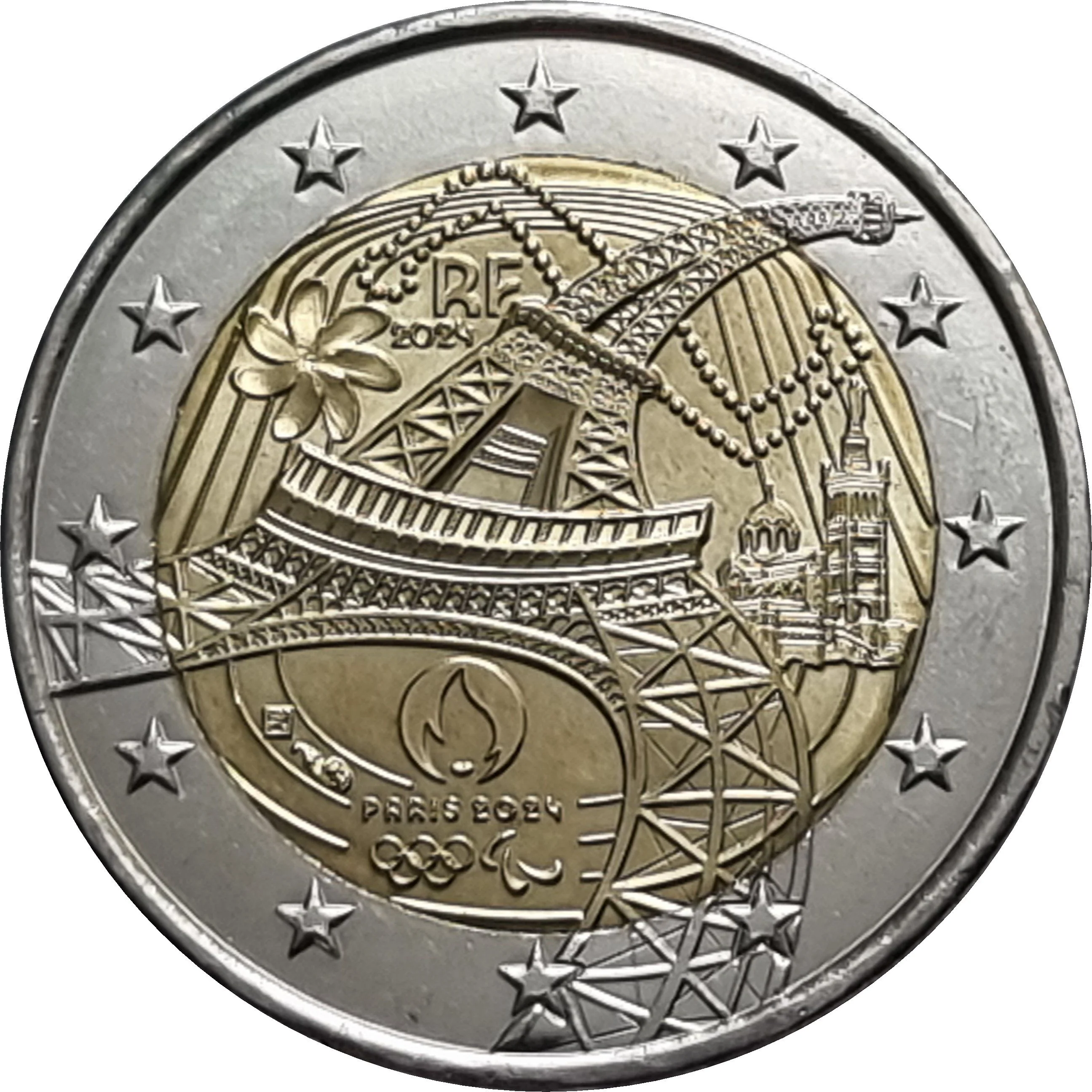 The Eiffel Tower as a sprinter, flanked by a Tiare flower and Notre-Dame de la Garde, within the EU's circle of stars.