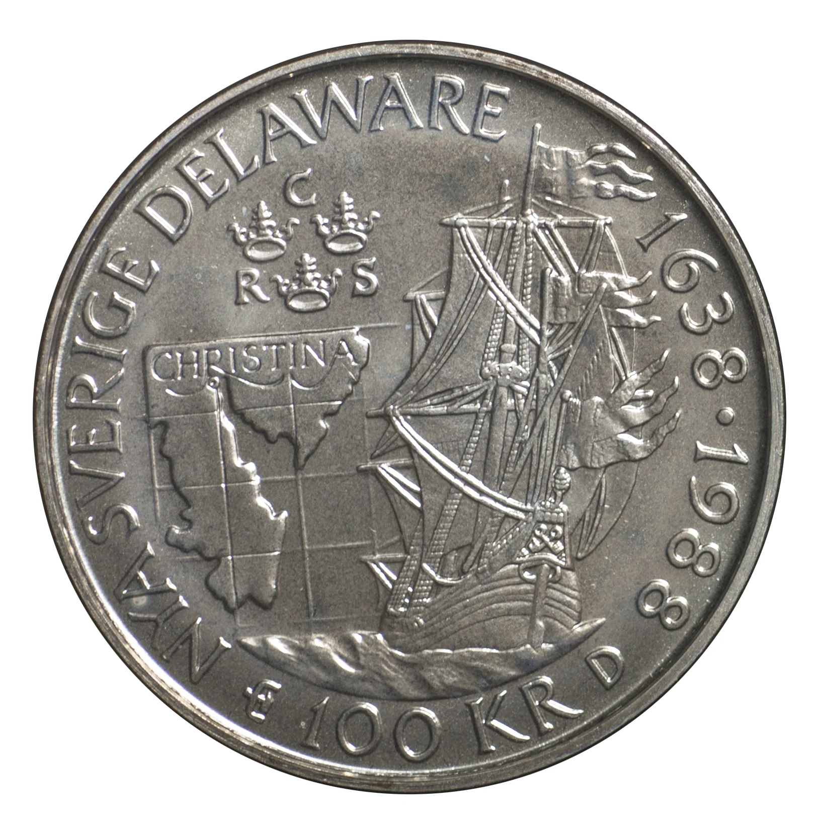 Right: The ship "Kalmar Nyckel" sailing at sea. Left: A Delaware map excerpt highlighting Fort Christina, topped by Queen Christina's three-crown monogram (CRS) from period coins. The rim inscription shows the coin's value flanked by mint and governor initials.