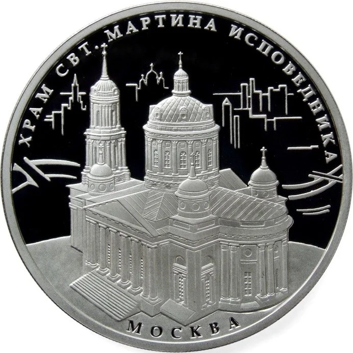 Depicts the Temple of Saint Martin the Confessor in Moscow, with the inscriptions "ХРАМ СВТ. МАРТИНА ИСПОВЕДНИКА" above and "МОСКВА" below.