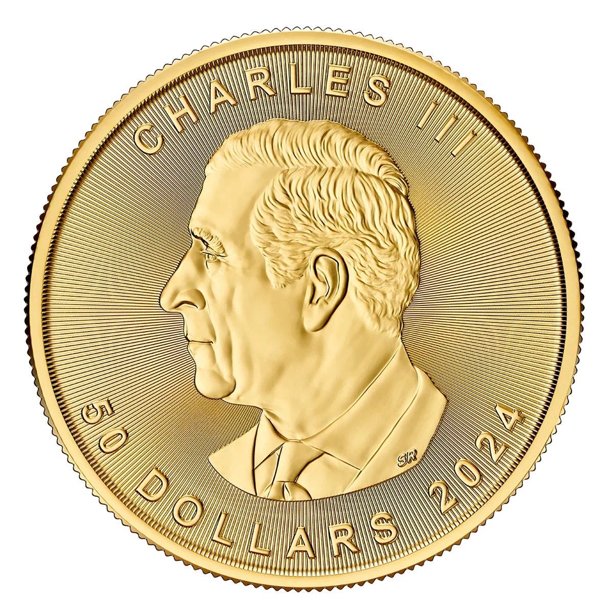 Classic maple leaf design encircled by lettering, with a small maple leaf security feature below containing the last two digits of the year.