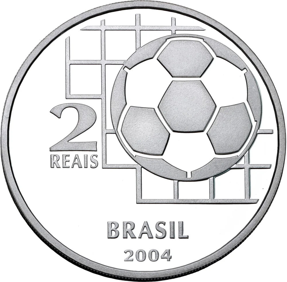 The reverse features "2 Reais," "Brasil," "2004," and a stylized ball and net with the goal time.