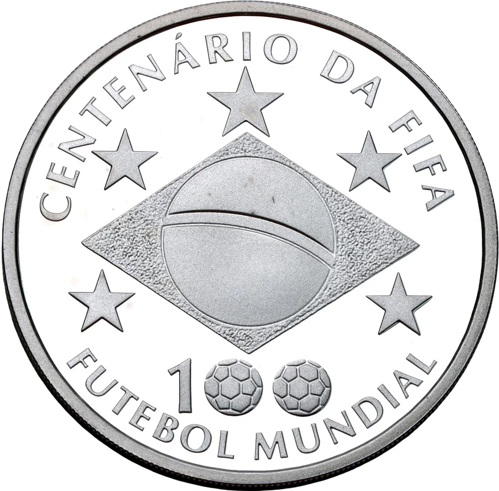 A stylized Brazilian flag is surrounded by five stars, the number 100 made of soccer balls, and the text "Centenário da Fifa" and "Futebol Mundial".