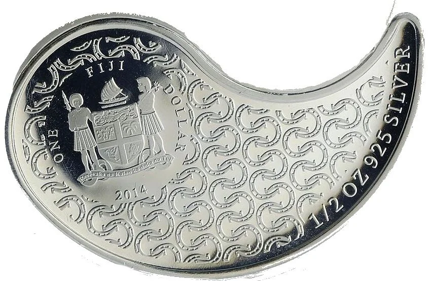 Fiji coat of arms, 1/2 oz .925 silver, horseshoe-patterned background.