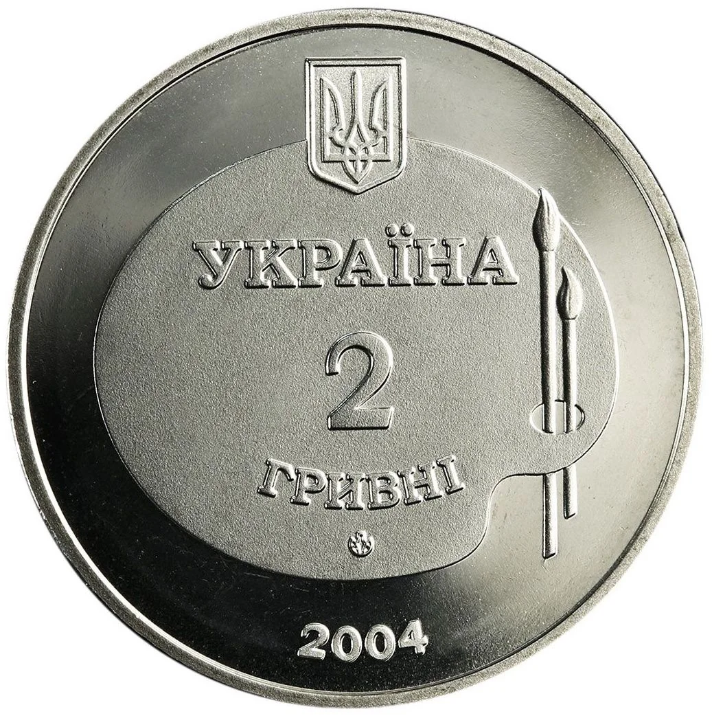 The small National Emblem of Ukraine is above a three-line inscription ("УКРАЇНА / 2 ГРИВНІ") and the Mint logo, all set on an artist's palette with two brushes. Below is the year 2004.