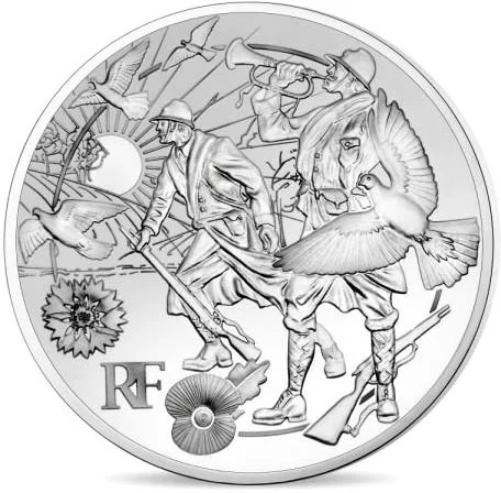 A sunrise marks Armistice Day. A bugler sounds the cease-fire as soldiers drop their rifles, with doves flying in the foreground.