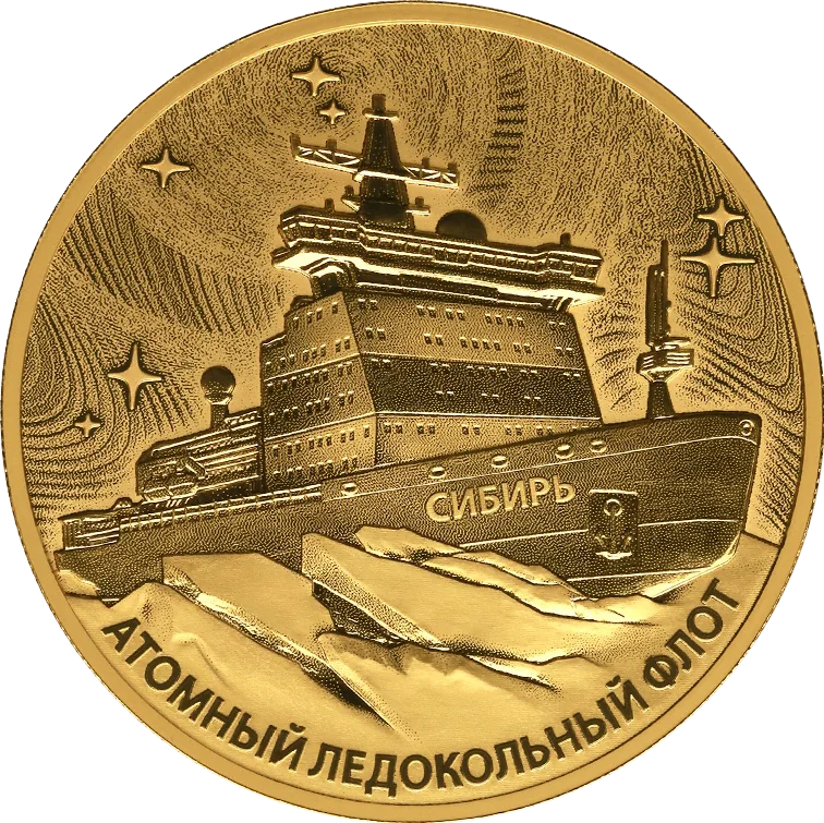 The disc's mirror field has a relief image of the nuclear icebreaker Sibir amid ice ridges, set against a laser-treated matte starry sky. The inscription 'АТОМНЫЙ ЛЕДОКОЛЬНЫЙ ФЛОТ' encircles the bottom circumference.