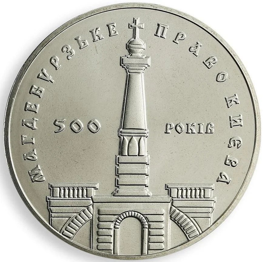 Monument to Kyiv's Magdeburg Right by A. Melensky (1802-1808). Inscriptions: "МАГДЕБУРЗЬКЕ ПРАВО КИЄВА" and "500 РОКІВ".