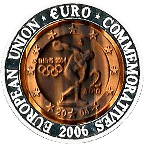 Male discus thrower statue in tiger's-eye, with Athens relief and Greek 2€ coin reverse design.