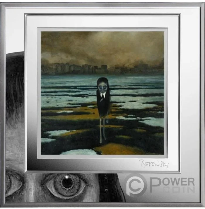 A Beksiński "Figure" featuring his nightmarish landscapes, grotesque forms, and eerie atmosphere.