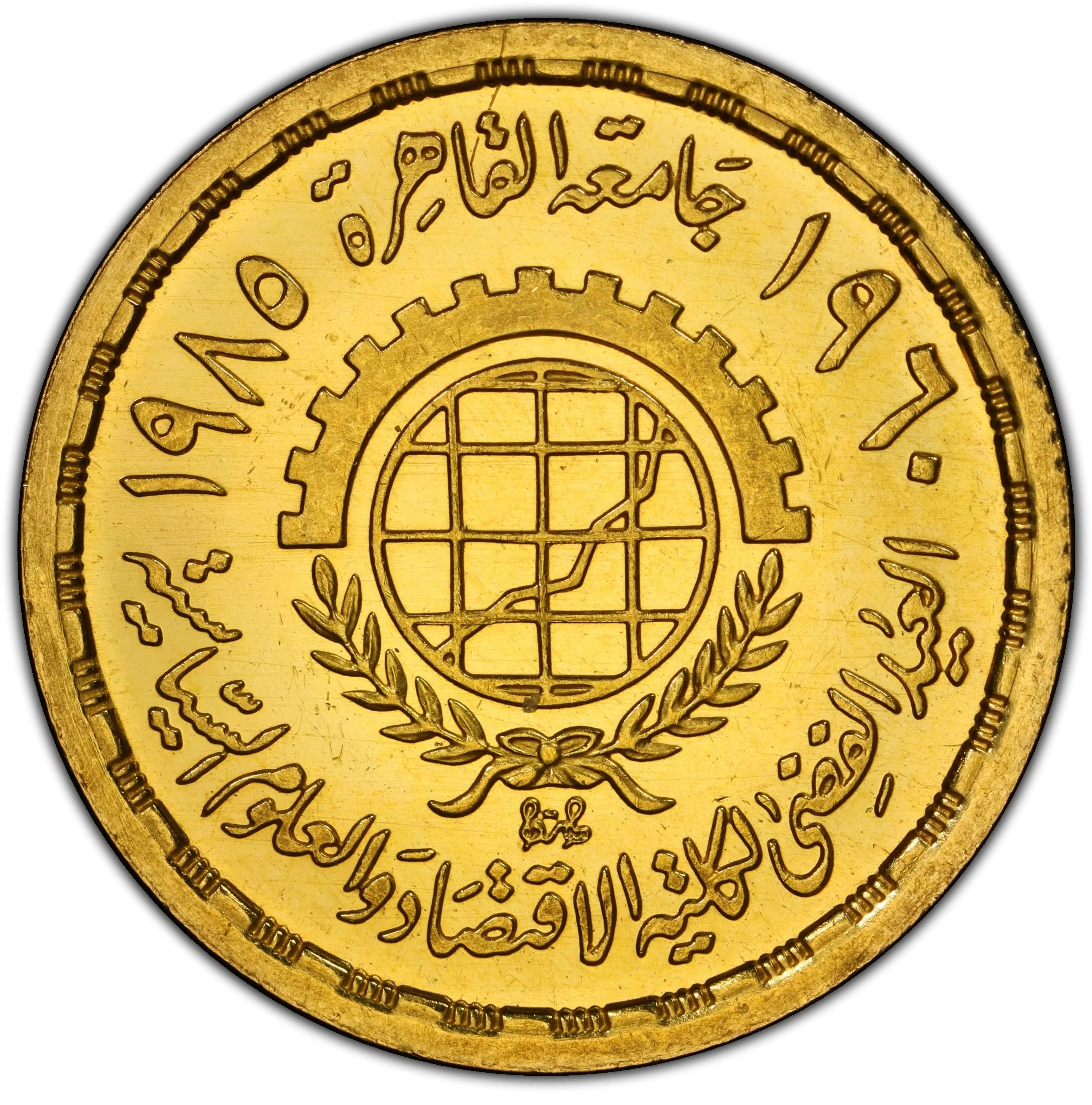 Center: Emblem with a circle design, half-wreathed and half-geared. Border: "Cairo University 1960 - 1985 Faculty of Economics and Political Science Silver Anniversary."