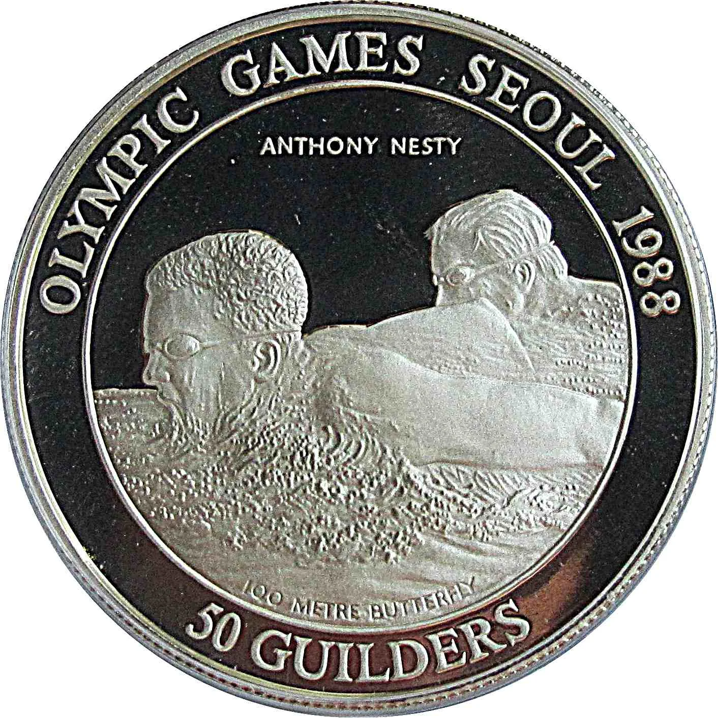 Two swimmers left, Anthony Nesty on left. Text around image.