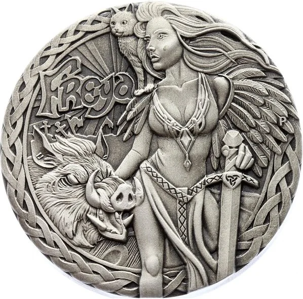 Freya wears her feathered cloak, holds a sword, and stands with her boar Hildisvini, a shield, a battlefield behind her, and a cat on her shoulder.