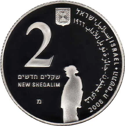 Israeli State Emblem and face value in Hebrew and English. Central silhouette of S.Y. Agnon in his hat. "Israel" in English, Hebrew, and Arabic with mint year around the border.