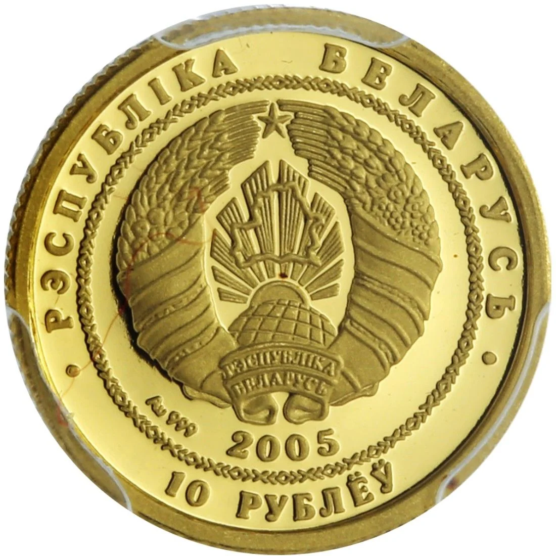 Description: Center: relief of the State Coat of Arms. Below: year, gold standard, and face value "10 РУБЛЁЎ". Top rim inscription: "РЭСПУБЛІКА БЕЛАРУСЬ".
