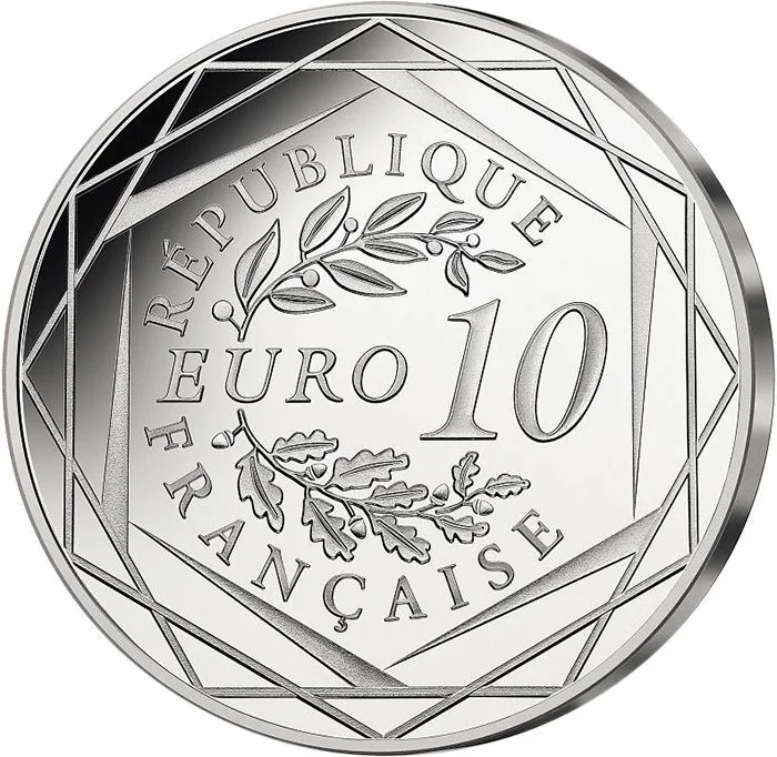 "10 EURO" flanked by laurel and oak branches, encircled by "RÉPUBLIQUE FRANÇAISE," three hexagons, and the issue year.