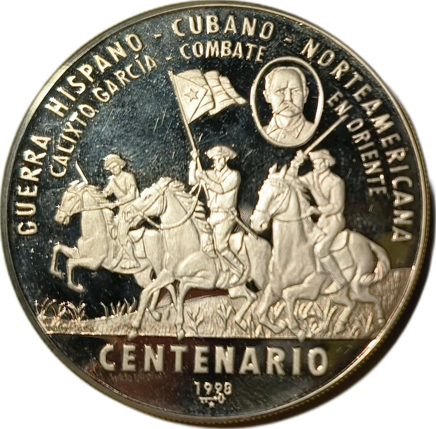 General Calixto García leading troops at the Battle of Orient. Portrait insert. Event description, date, and mintmark below.