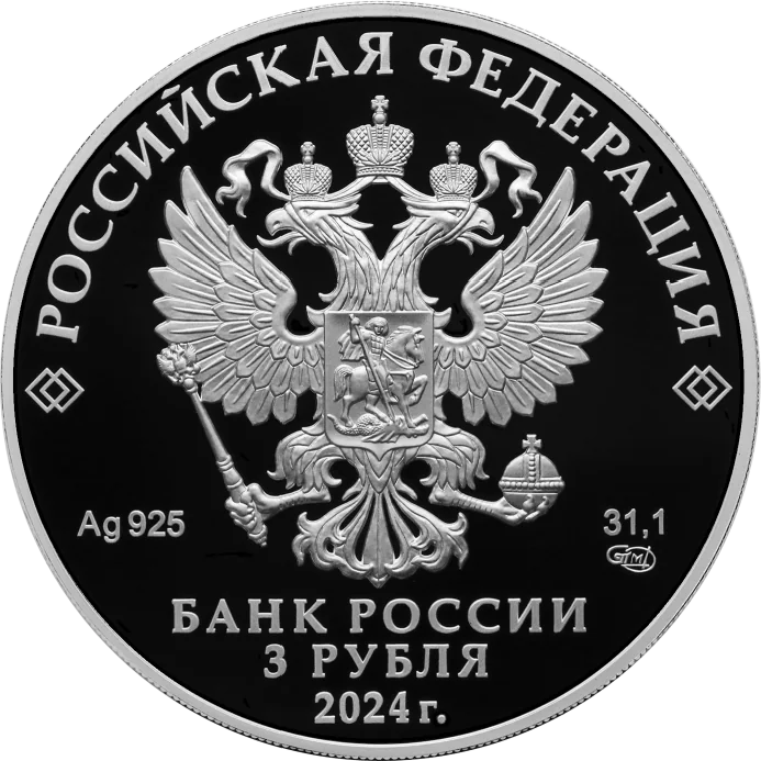 The obverse features the Russian coat of arms, inscriptions for "Russian Federation" and "Bank of Russia," the denomination "3 Roubles," the issue year "2024," the metal's chemical symbol, fineness, mint mark, and fine metal content.