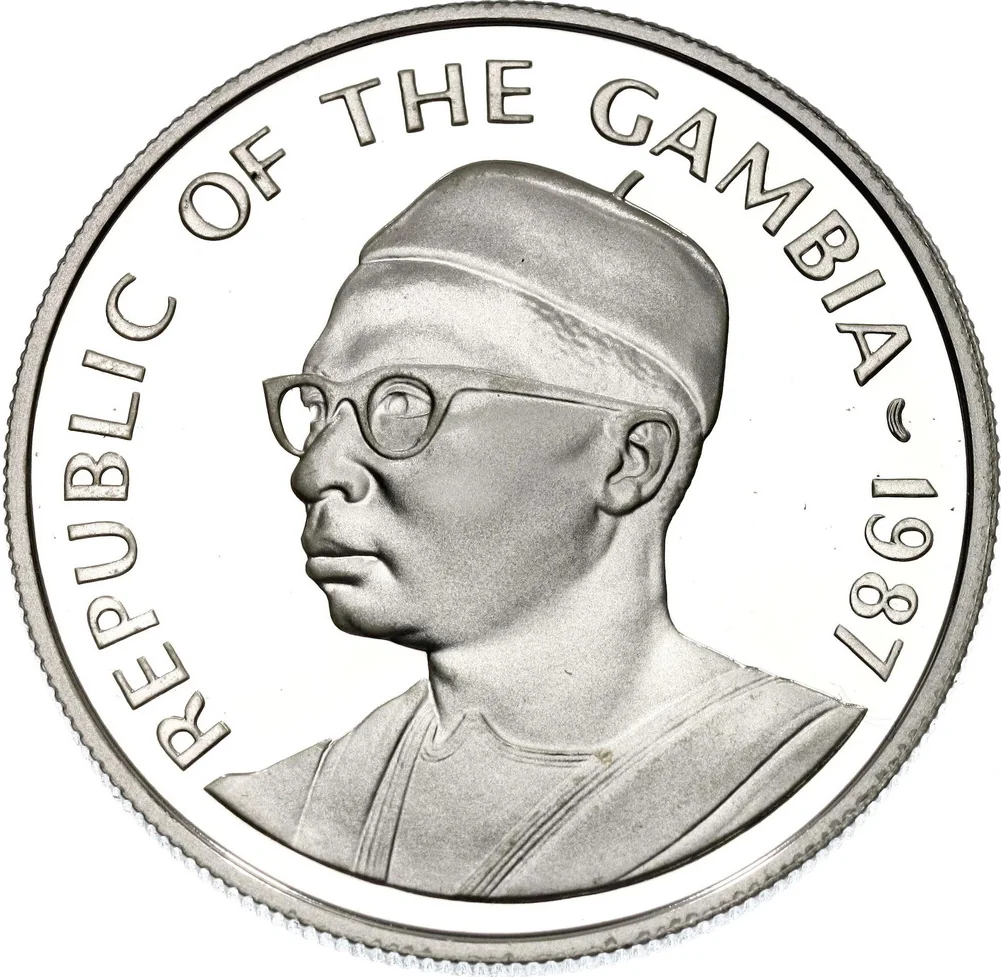 President Kairaba Jawara bust, left profile, with date beside.