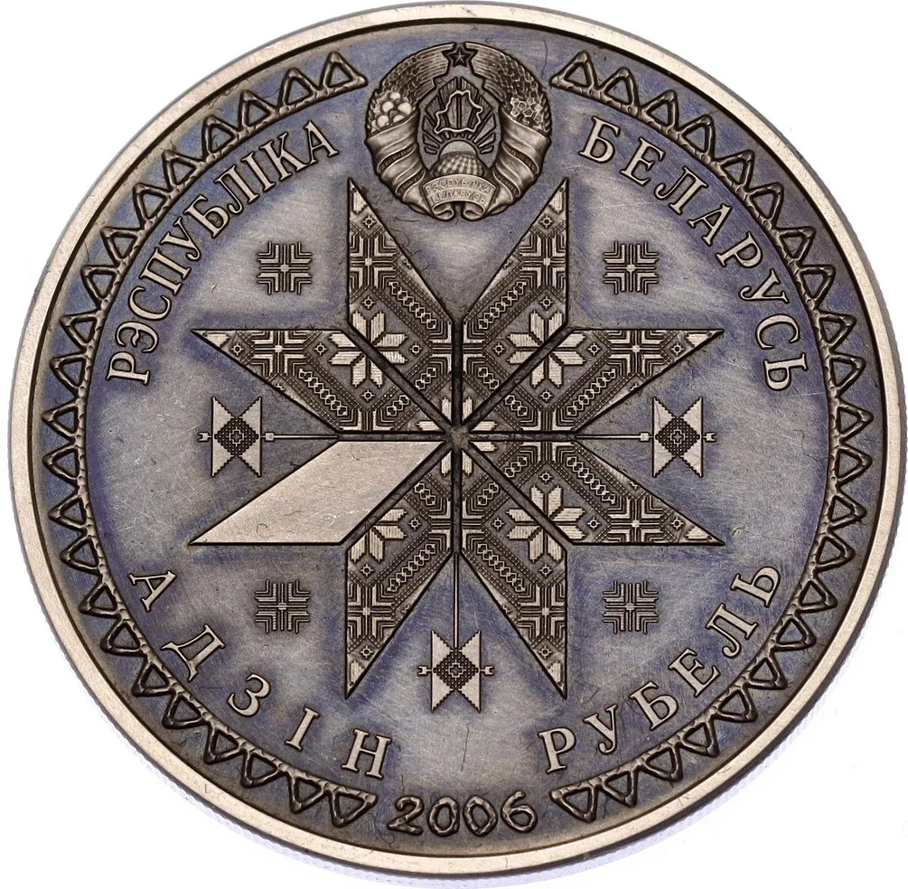 Description: The circular ornament features the relief of the State Coat of Arms. At its center is a solar sign—an octagonal figure with rhombic decor representing rays. Below is the year of issue. The rim is inscribed "РЭСПУБЛІКА БЕЛАРУСЬ" at the top and "АДЗІН РУБЕЛЬ" at the bottom.