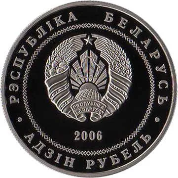 Circular ornament with relief State Coat of Arms. Below: year. Rim inscriptions: "РЭСПУБЛІКА БЕЛАРУСЬ" above, "АД3ІН РУБЕЛЬ" below.