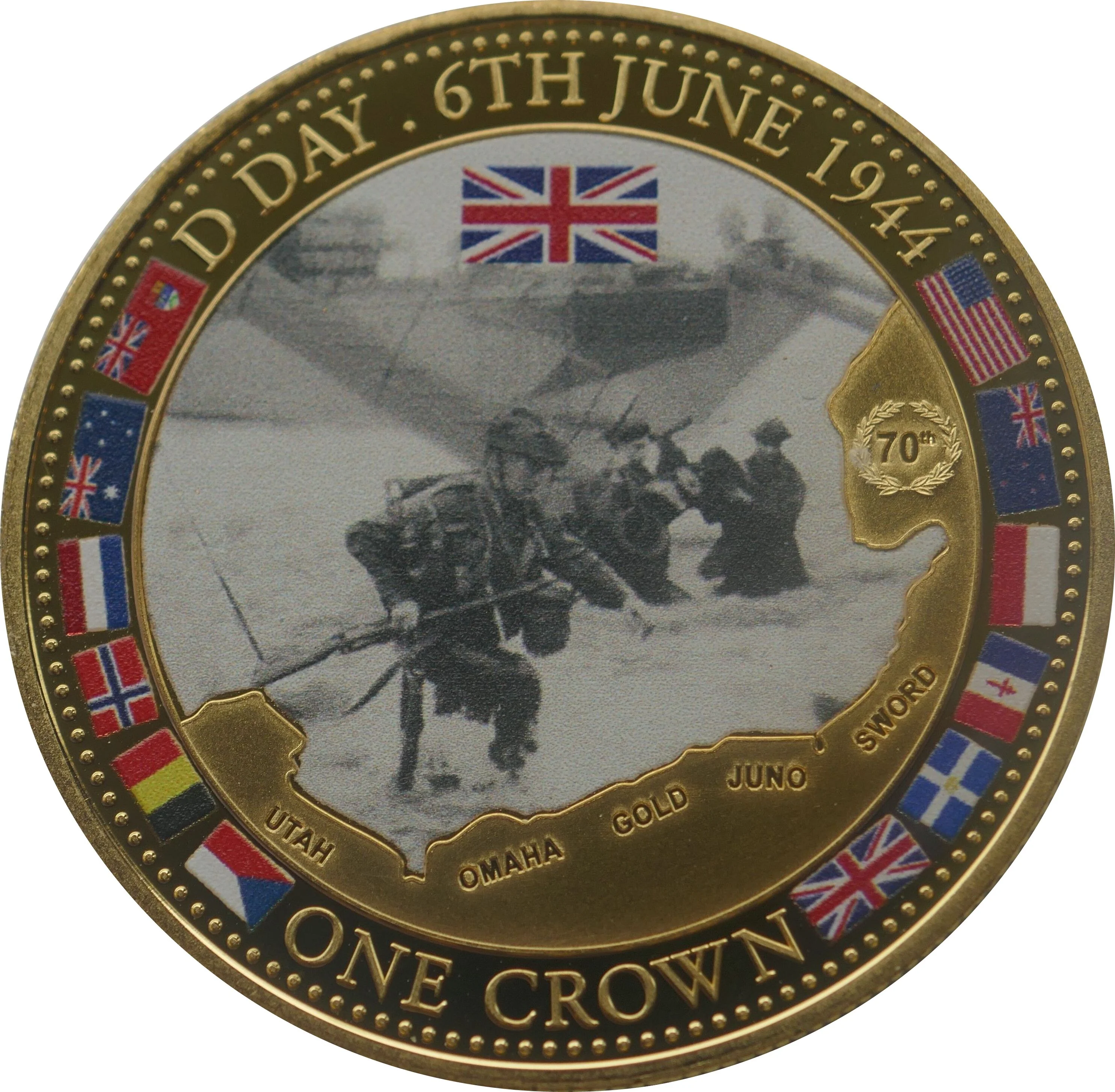 Description: Black and white photo of soldiers wading ashore, with a color Union Jack above. The names of the five beaches are below, flanked by Allied flags. "70th" appears within a wreath beside the denomination.