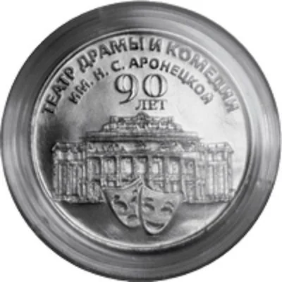 Description: The center features the N.S. Aronetskaya Drama and Comedy Theater building (Tiraspol), topped by a two-line inscription. Below are theatrical masks; above, a circular two-line inscription.