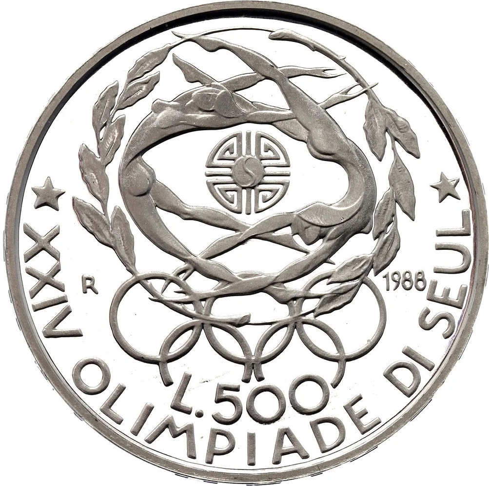 Circular design with two gymnasts, Olympic rings, and olive branches around a Korean decoration. Sides show date and mintmark; bottom shows value.
