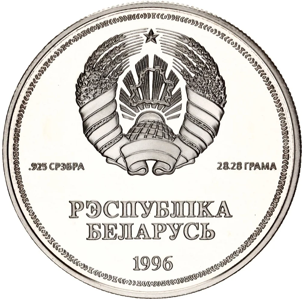 Centered is Belarus's State Coat of Arms relief, above the inscription "РЭСПУБЛIКА БЕЛАРУСЬ" and below the year, weight, and alloy.