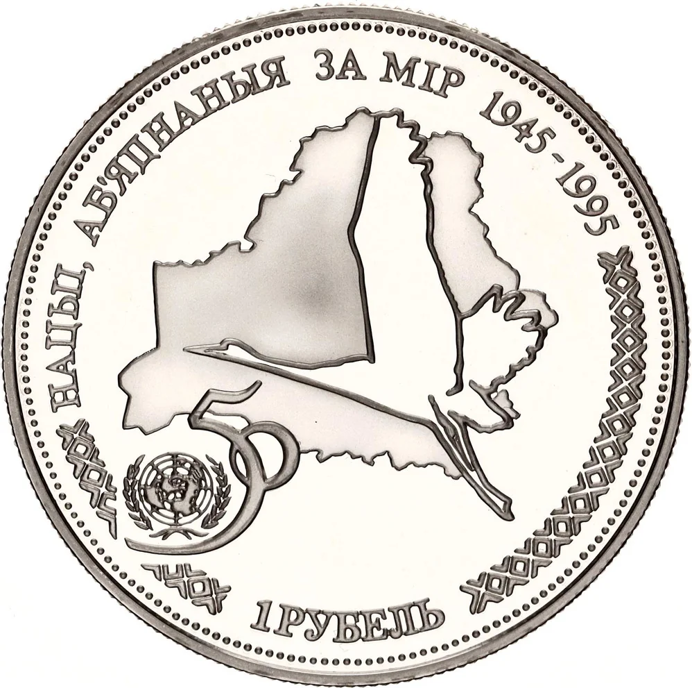 A stork hovers over a map of Belarus. Below left: UN emblem with "50". Rim inscription: "НАЦЫI, АБ'ЯДНАНЫЯ ЗА MIP • 1 РУБЕЛЬ".
