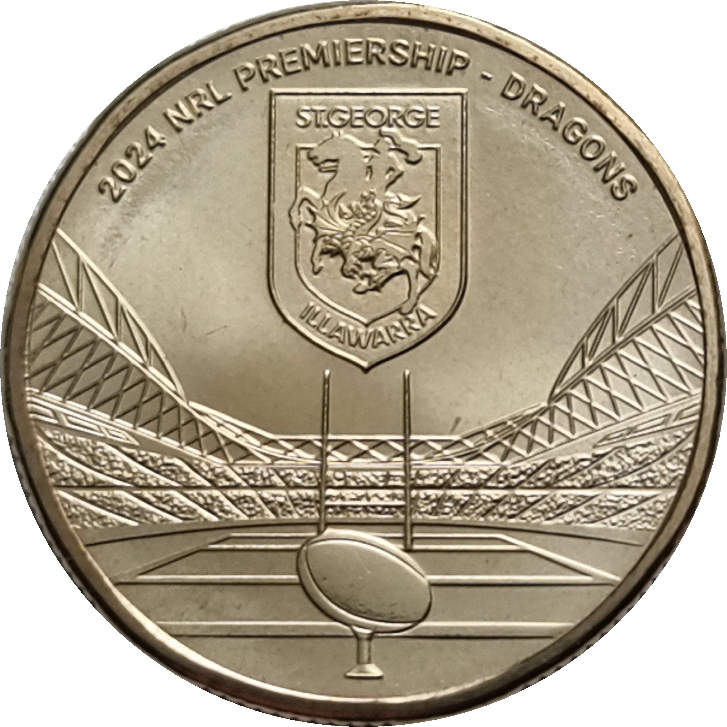 St George Illawarra Dragons logo above a rugby ball on a tee before goalposts in a stadium.
