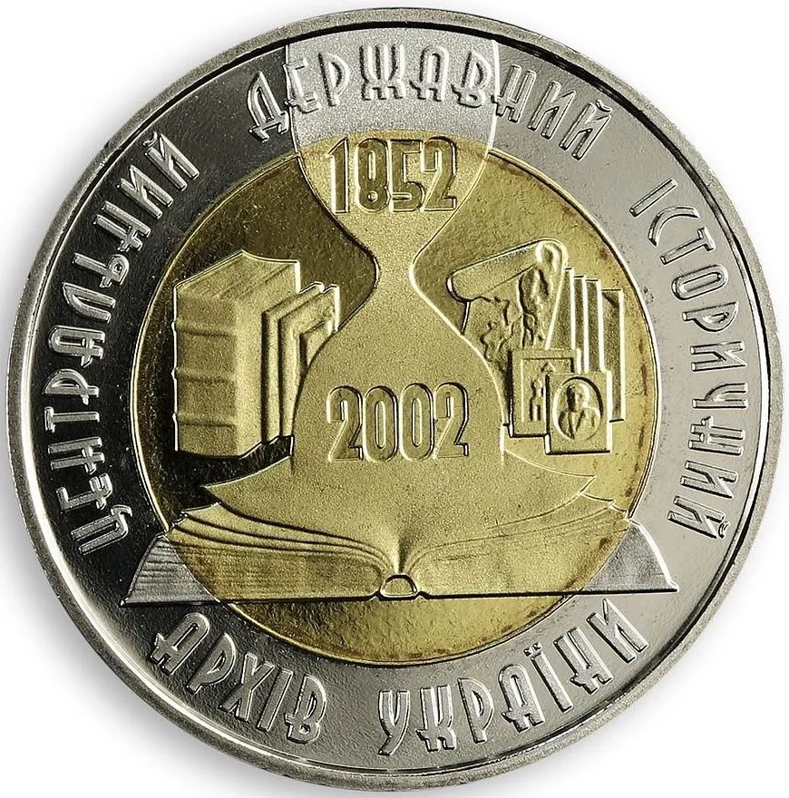 Description: A sandglass symbolizing time stands between the dates 1852 (above) and 2002 (below), flanked by books, maps, and pictures. Around it is the inscription: ЦЕНТРАЛЬНИЙ ДЕРЖАВНИЙ ІСТОРИЧНИЙ АРХІВ УКРАЇНИ.