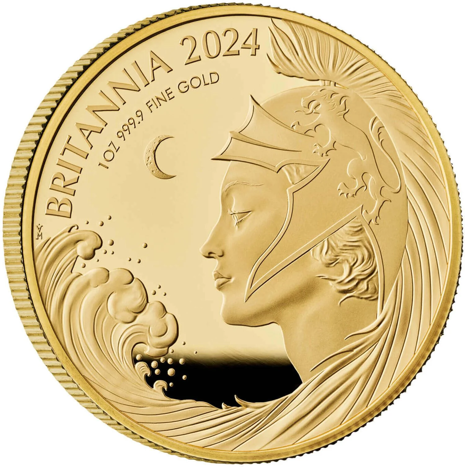 Britannia with wave and crescent moon.