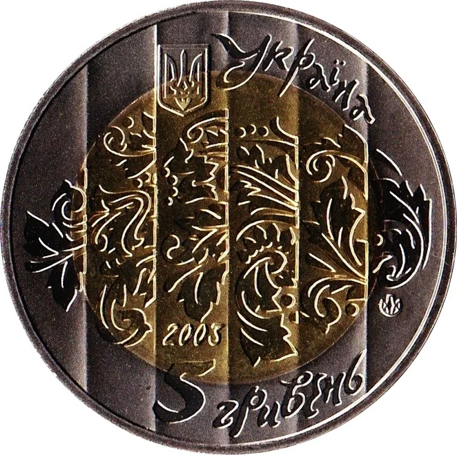 The raised obverse depicts bandura strings, with a Ukrainian song stylized as Baroque ornamentation. Above is the small National Emblem of Ukraine and the stylized inscription "УКРАЇНА" in Cossack script. Below are the year 2003, the denomination "5 ГРИВЕНЬ," and the NBU Mint logotype.