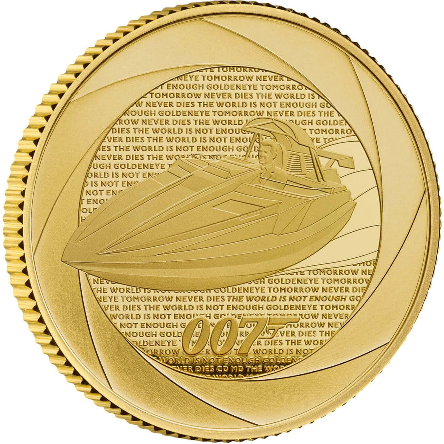 Q-Branch's speedboat from 'The World Is Not Enough' against 1990s Bond titles and '007'.