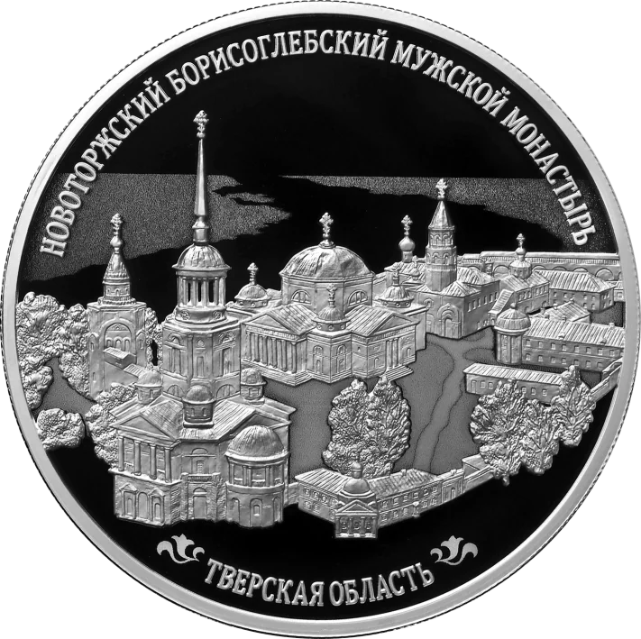 The reverse depicts the Novotorzhsky Saint Boris and Gleb Monastery in laser-matte relief, with the inscription "НОВОТОРЖСКИЙ БОРИСОГЛЕБСКИЙ МУЖСКОЙ МОНАСТЫРЬ" above and "ТВЕРСКАЯ ОБЛАСТЬ" within ornamental elements below.