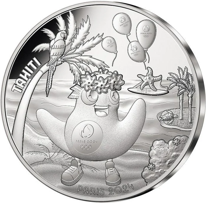 Phryge, the Paris 2024 mascot, wears a flower crown on a Tahiti beach.