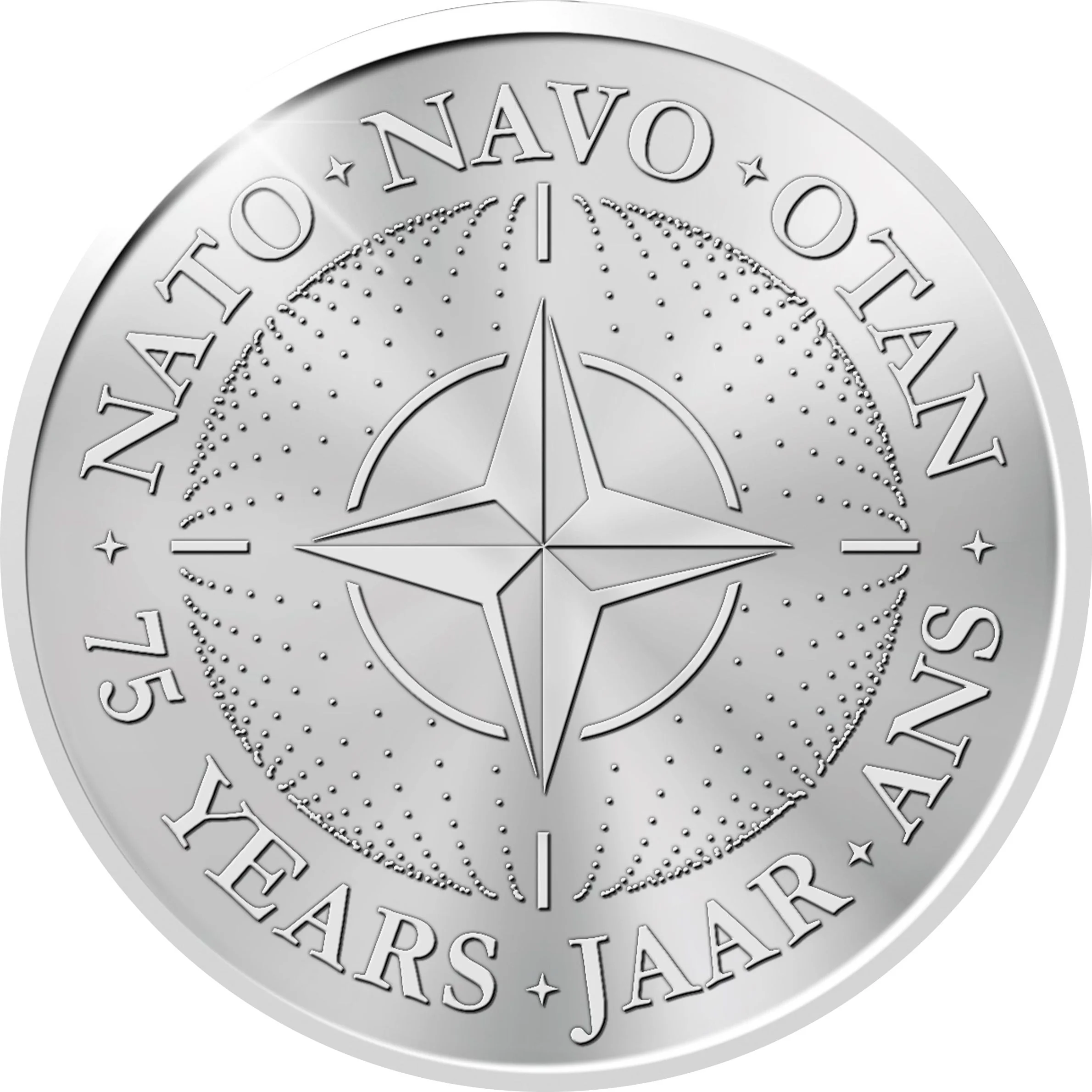 The NATO emblem, projected on a globe of dots, with the abbreviation in English, Dutch, and French. Circular text: NATO * NATO * OTAN * 75 YEARS * YEARS * ANS, separated by NATO stars.