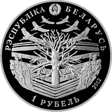 Reverse: Stylized landscape with tree, meadow, and cranes. Circumferential inscription "РЭСПУБЛІКА БЕЛАРУСЬ" above, denomination "1 РУБЕЛЬ" and year "2012" below.