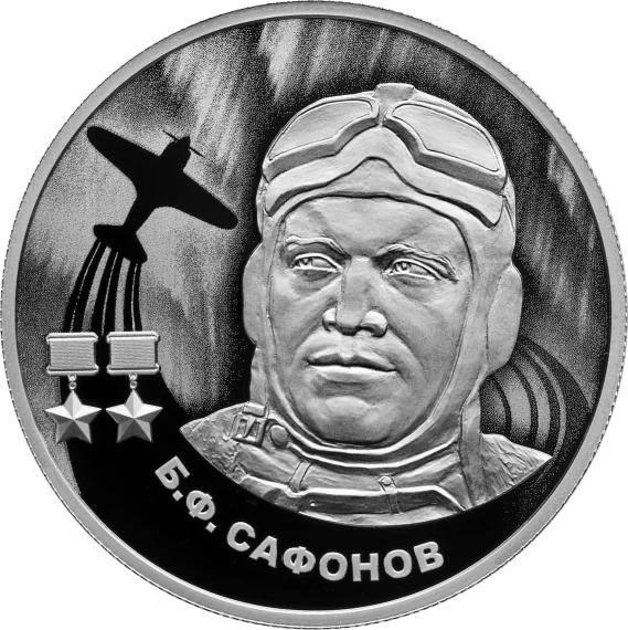 A matte laser-engraved relief portrait of Boris Safonov, twice Hero of the Soviet Union, with Gold Star medals, a flying plane silhouette with a trail, and the aurora borealis. The semicircular inscription reads ‘Б.Ф. САФОНОВ’.