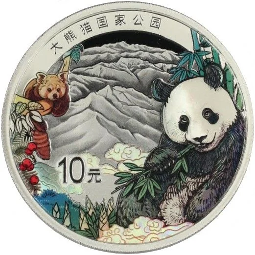 The reverse shows a giant panda, red panda, and dove tree leaves against the park's scenery, with "Giant Panda National Park" in Chinese above and "10 yuan" centered below.