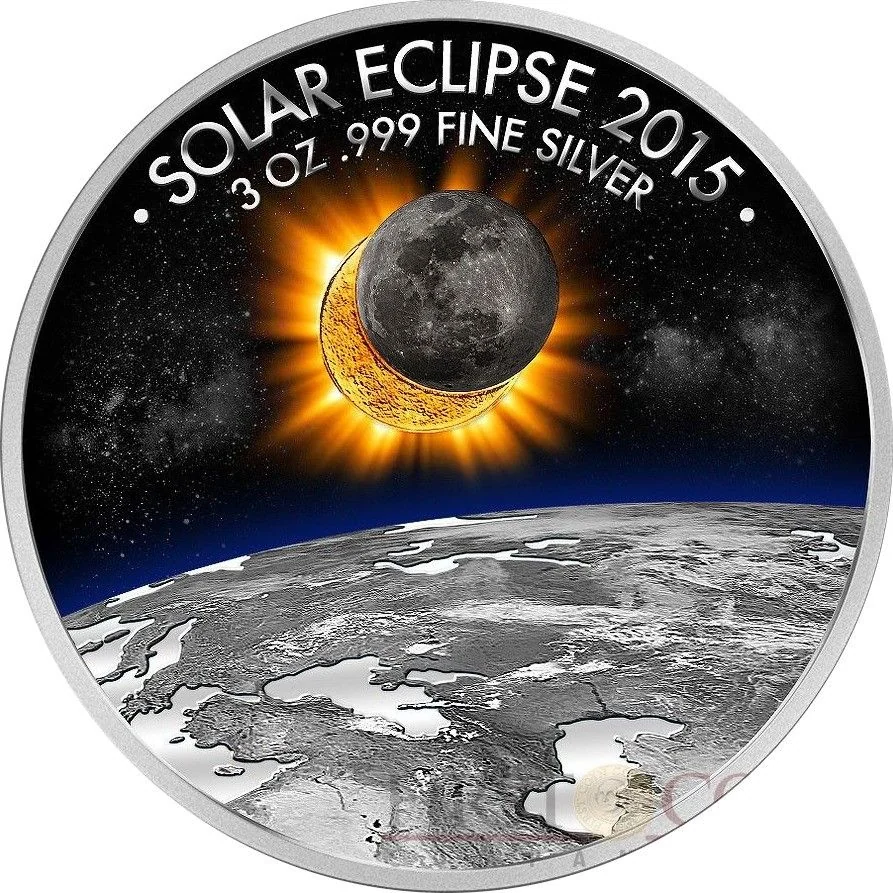 The reverse depicts the 2015 solar eclipse over the moon's cratered surface, with a gold-plated sun and the inscription "Solar Eclipse 2015."