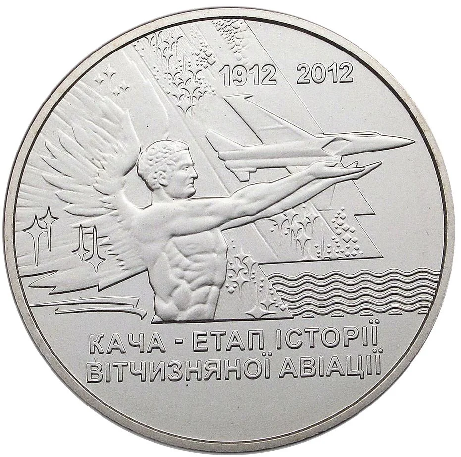 The obverse features Ukraine's small coat of arms and the legend "НАЦІОНАЛЬНИЙ БАНК УКРАЇНИ". The 2012 issue year and NBU logo are at left, the Kacha coat of arms is centered, and the denomination "5 ГРИВЕНЬ" is at right over an airfield map.