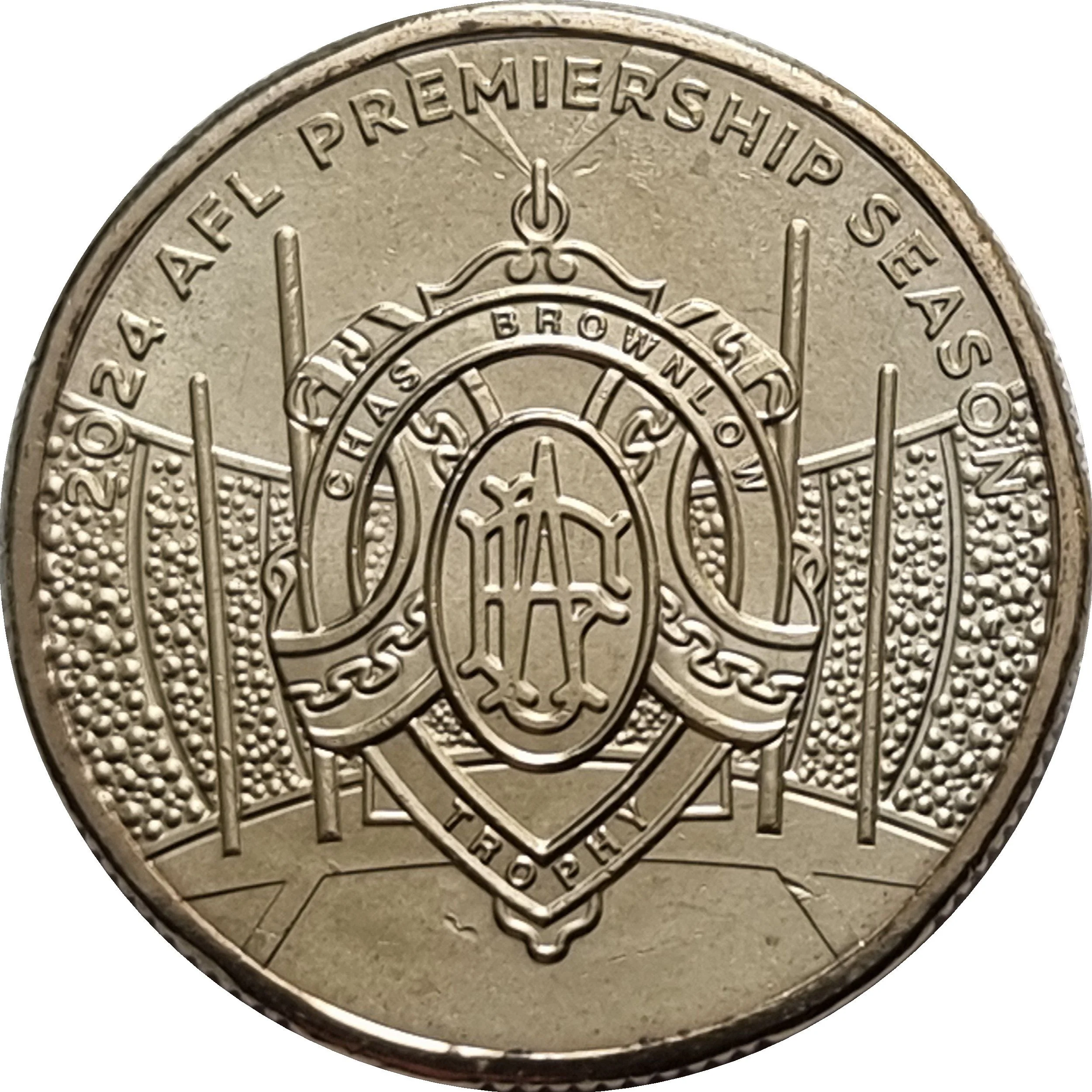 Chas Brownlow Medal before four AFL goalposts, with AFL logo below.