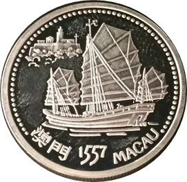 A Chinese junk sails leftward beneath Macau's Guia Fortress and lighthouse, with Chinese and Portuguese text below.
