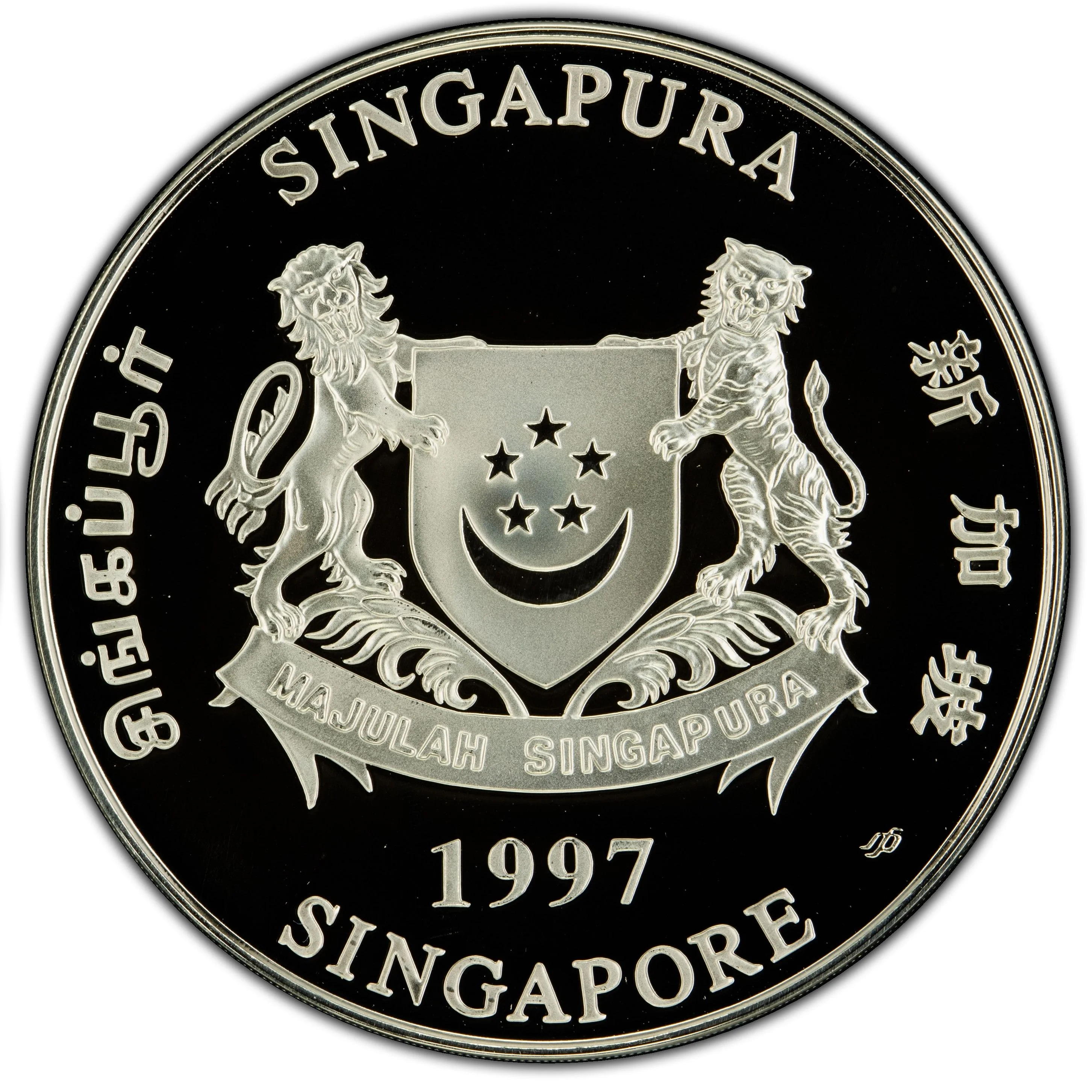 Emblem with date; 'Singapore' encircles it in English, Tamil, Chinese, and Malay.