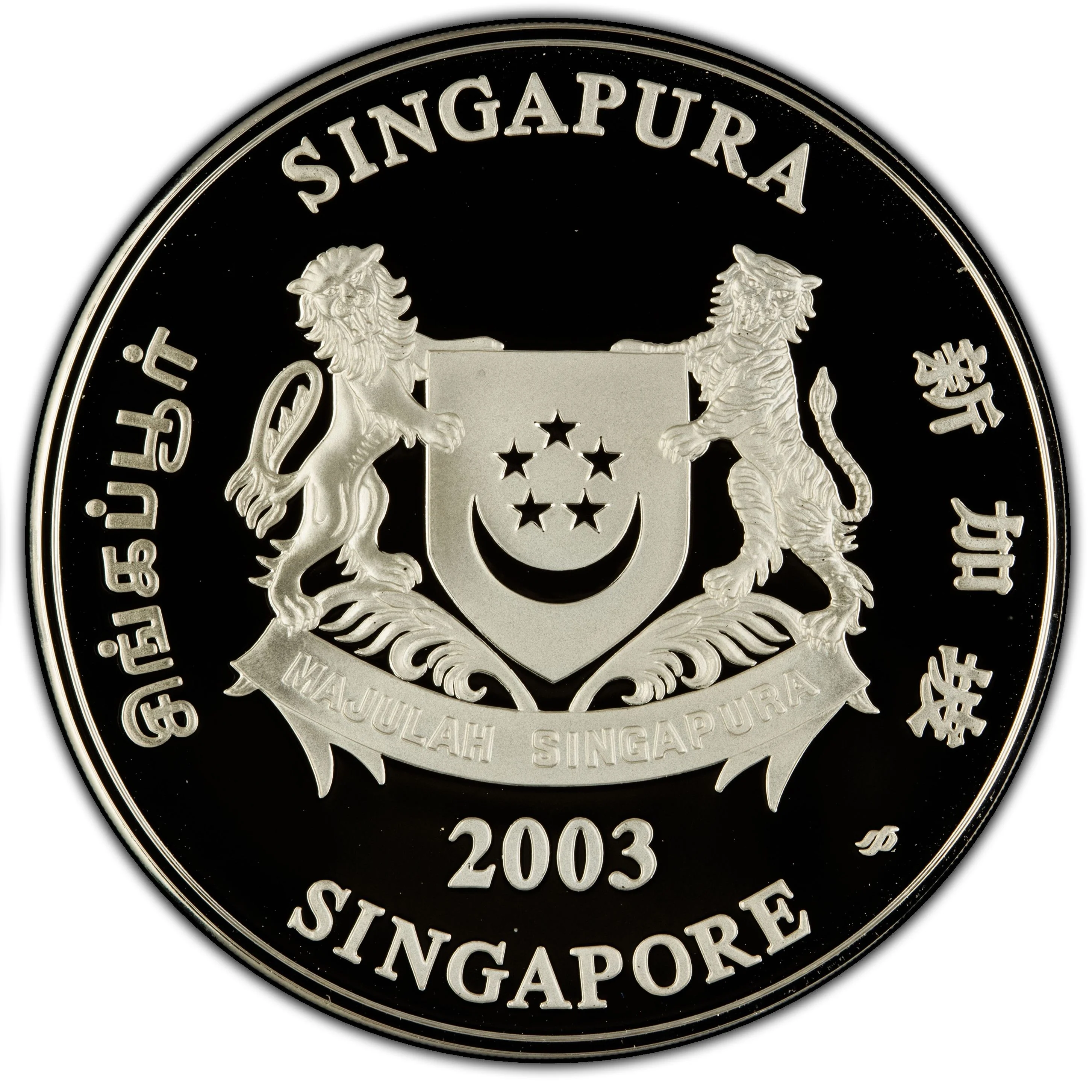 Emblem with date; 'Singapore' encircles it in English, Tamil, Chinese, and Malay.