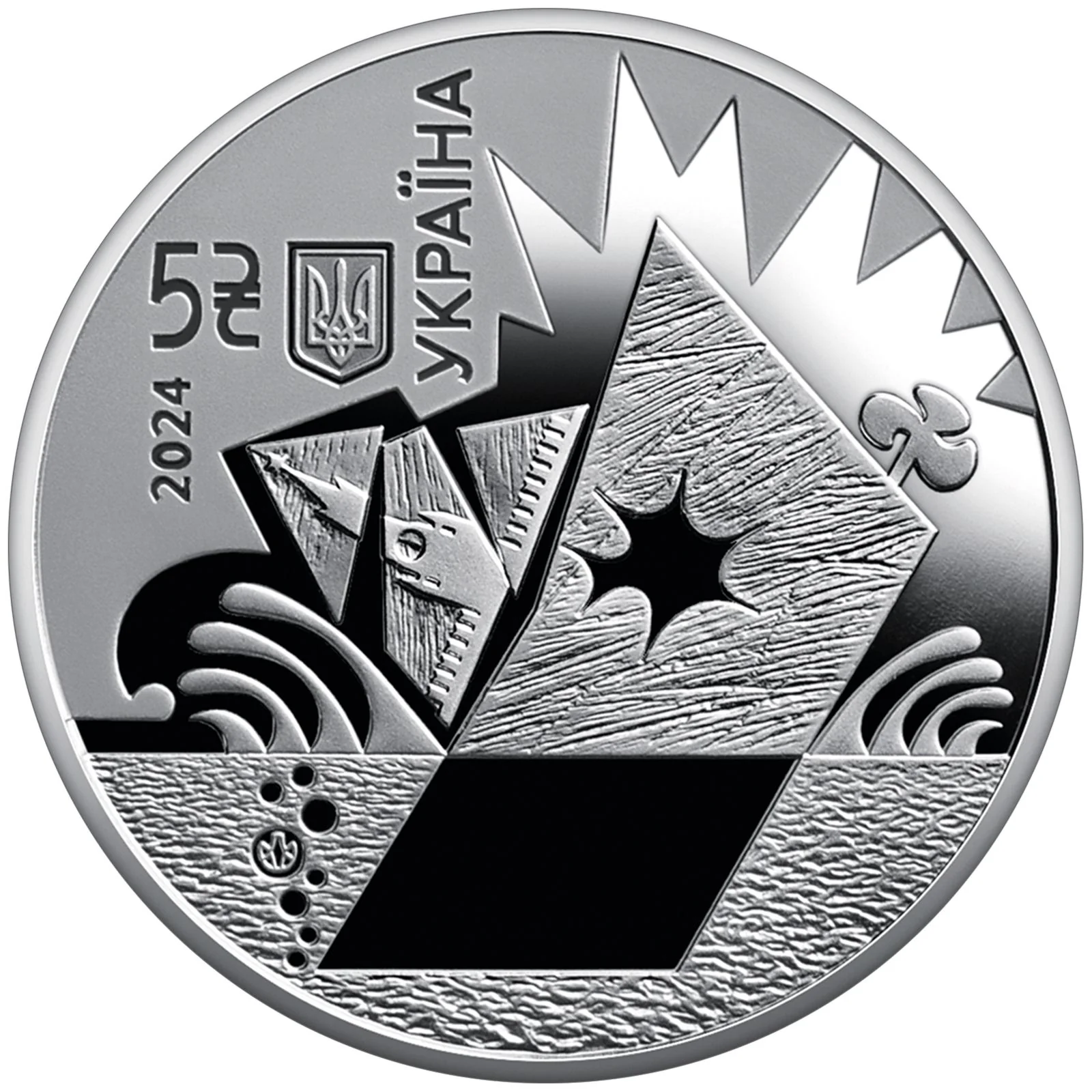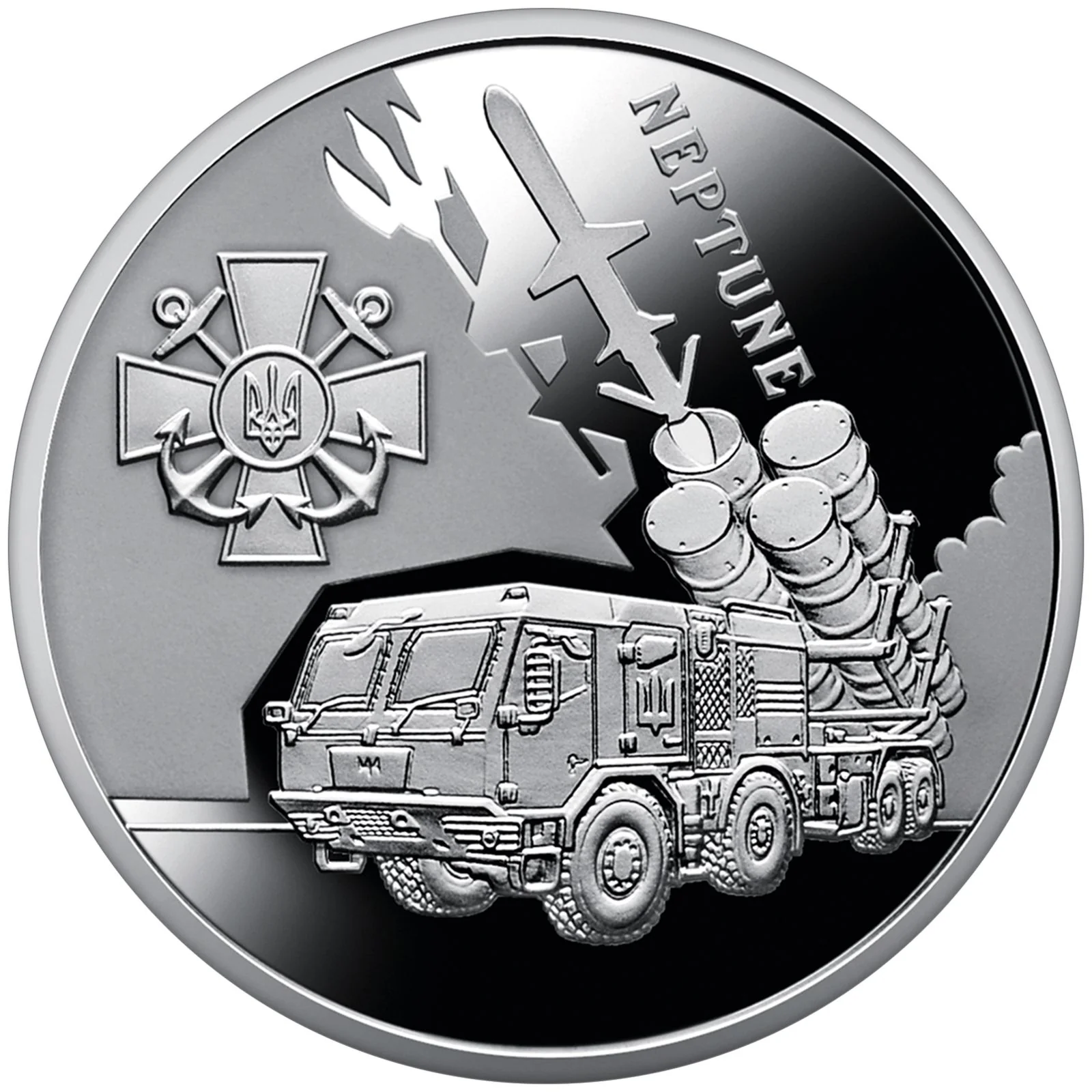 The Neptune coastal missile system, operated by the Ukrainian Navy (emblem, upper left), launches a missile. The stylized trident of Neptune against the background symbolizes Ukraine's indomitable spirit piercing enemy targets. The word "NEPTUNE" runs parallel to the missile.